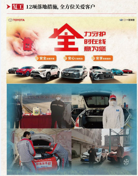 一汽豐田各地工廠從2月中旬便開(kāi)始陸續(xù)復(fù)產(chǎn),同時(shí)品牌積極馳援遍布全國(guó)各地的經(jīng)銷商伙伴,累積提供了超百萬(wàn)只口罩和消毒水等防護(hù)物資,并帶領(lǐng)經(jīng)銷商伙伴在保障客戶和工作人員安全健康的前提下,圍繞客戶快速推進(jìn)“復(fù)工”,通過(guò)安心店面環(huán)境、安心定制購(gòu)車、安享管家服務(wù)三大方向的12項(xiàng)措施,全方位關(guān)愛(ài)客戶。