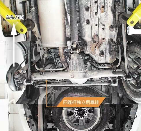 車身大梁中部有加強肋,大大提高了剛度,大梁與車身的連接處使用了較厚的橡膠襯套,慮振效果較好。油箱有金屬蓋板保護,上面有導(dǎo)流槽以及通風(fēng)孔,有利于氣流快速通過并且?guī)ё邿崃俊!≈醒氩钏倨鲙Р钏冁i,為托森限滑差速器類型。 后為開放式差速器,不帶差速。前后減震支柱均為日本制造。