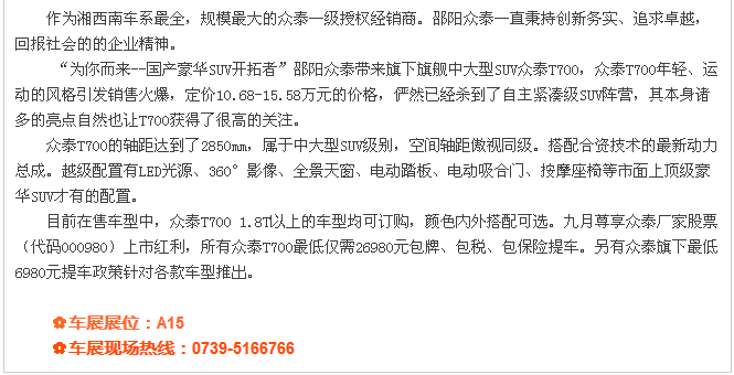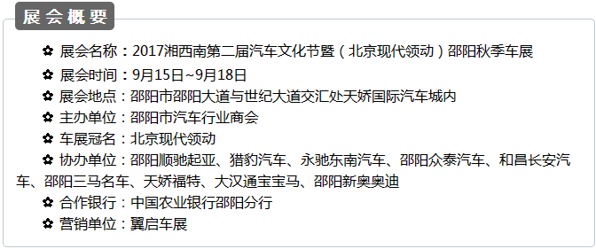 【915-918邵陽(yáng)秋季車展】 9月15日-9月18日,2017湘西南第二屆汽車文化節(jié)暨(北京現(xiàn)代領(lǐng)動(dòng))邵陽(yáng)秋季車展將于天嬌國(guó)際汽車城隆重舉辦。本屆車展由邵陽(yáng)市政府批準(zhǔn)、邵陽(yáng)市汽車行業(yè)商會(huì)主辦、北京現(xiàn)代領(lǐng)動(dòng)冠名,邵陽(yáng)順馳起亞、獵豹汽車、永馳東南汽車、邵陽(yáng)眾泰汽車、和昌長(zhǎng)安汽車、邵陽(yáng)三馬名車、天嬌福特、大漢通寶寶馬、邵陽(yáng)新奧奧迪協(xié)辦,合作銀行為:中國(guó)農(nóng)業(yè)銀行股份有限公司邵陽(yáng)分行。此次車展不僅僅是一場(chǎng)視覺(jué)的盛宴,更是一場(chǎng)震撼的汽車文化之旅!今天小編就給大家著重介紹一下此次車展冠名及協(xié)辦單位。